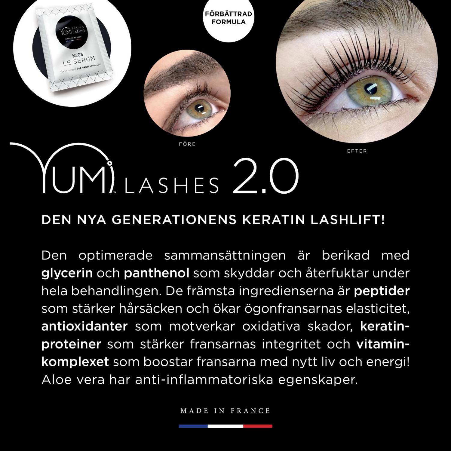 YumiLashes är EU/Svensk registrerad och godkänd hos Läkemedelsverket att användas på både hår och hud. En behandling som ger dina ögonfransar nytt liv och energi! Den optimerade sammansättningen baserad på panthenol, glycerin, peptider och aloe vera skyddar ögonfransarna under hela Yumi 2.0-behandlingen. Fyllt med skyddande vitaminer, kraftfulla antioxidanter och effektiva fuktgivare. Aminosyrablandningen ger riktad verkan och stimulerar tillväxten av ögonfransar.