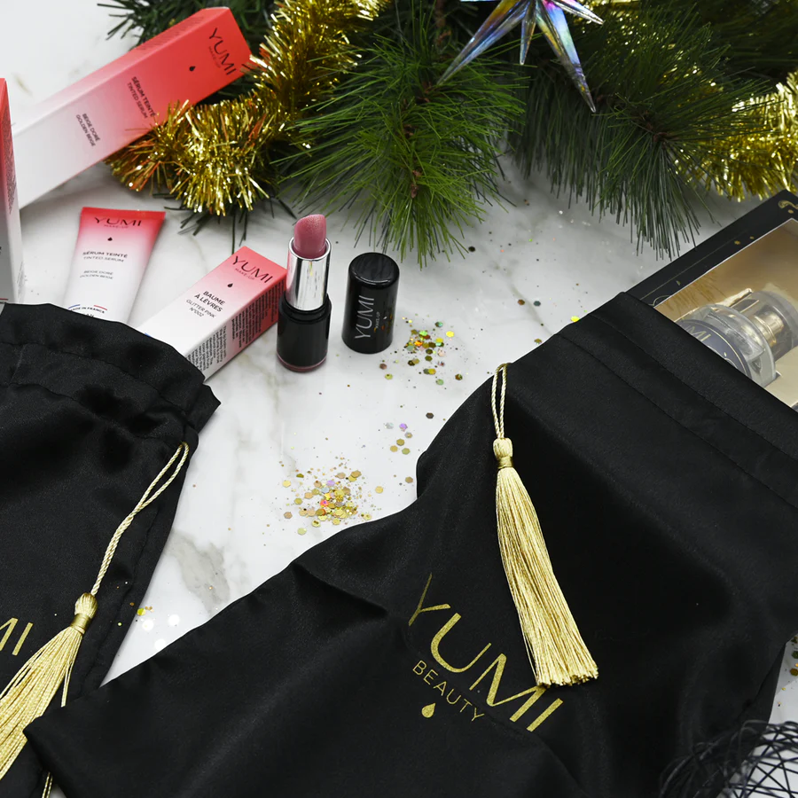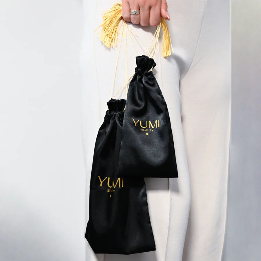 En riktigt vacker satinpåse med en snygg finish i svart. De dragsnörena är smyckade med guldiga tofsar. Denna eleganta påse är perfekt för att presentera YUMI-produkter på ett vackert sätt