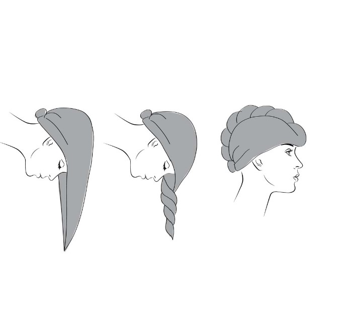 Luta huvudet framåt så att håret hänger ned över pannan. Placera handdukens breda ände vid nacken, utan att gnugga. Vrid försiktigt handduken runt håret några gånger och fäst den sedan med knappen i nacken. Perfekt för en skonsam och snabb torkning av ditt hår!