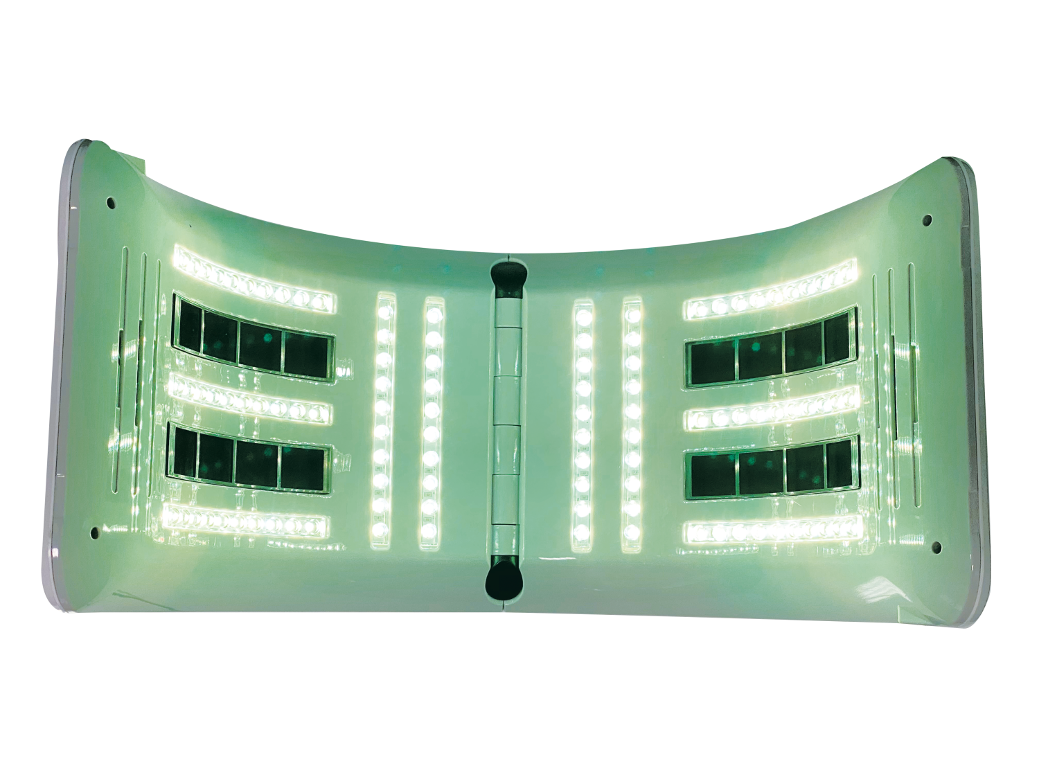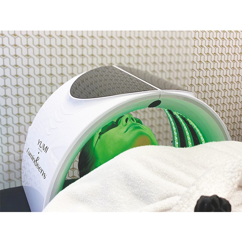 Yumi Lumin & Sense LED-tunneln är utrustad med 300 högkvalitativa LED-lampor som kan avge sju olika färger av ljus för att effektivt behandla ett brett spektrum av hudproblem, inklusive acne, rosacea, rodnad, papler, knölar och pustler.
